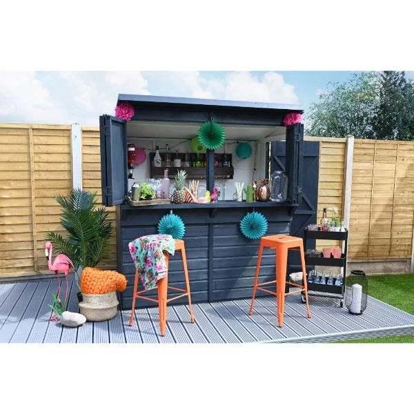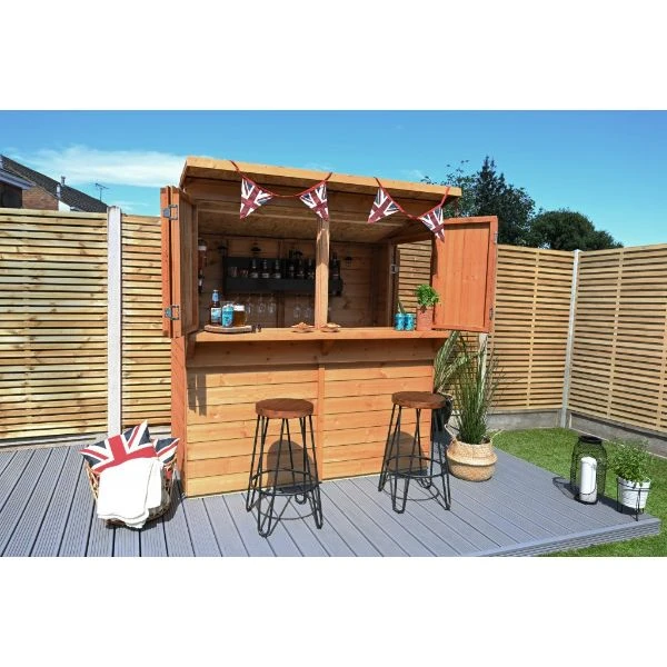 Convert your garden into a versatile outdoor entertainment space by adding a Wooden Garden Bar. Made using dip treated shiplap cladding this Wooden Garden Bar is the perfect addition to your garden this summer! It features a solid top bar and has two bi fold shutters that open easily to create a serving hatch. With access from the side, its modular design means the door can be fitted on either end of the building. This new design of garden bar allows for it to be locked up when not in use, ideal for storing drinks in the summer or used as a shed throughout the winter months. A great way to entertain in style at home, this garden bar is the perfect choice for serving friends and family drinks and food in your garden.