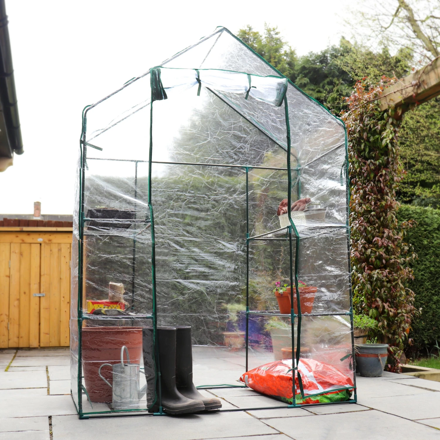 This walk in greenhouse has a roll up door with zip fasteners. It is the perfect tool accessory to keep animals away from your plants/seeds or to protect them from the weather. It has an easy no-tool assembly, no hassle! Perfect for your garden.