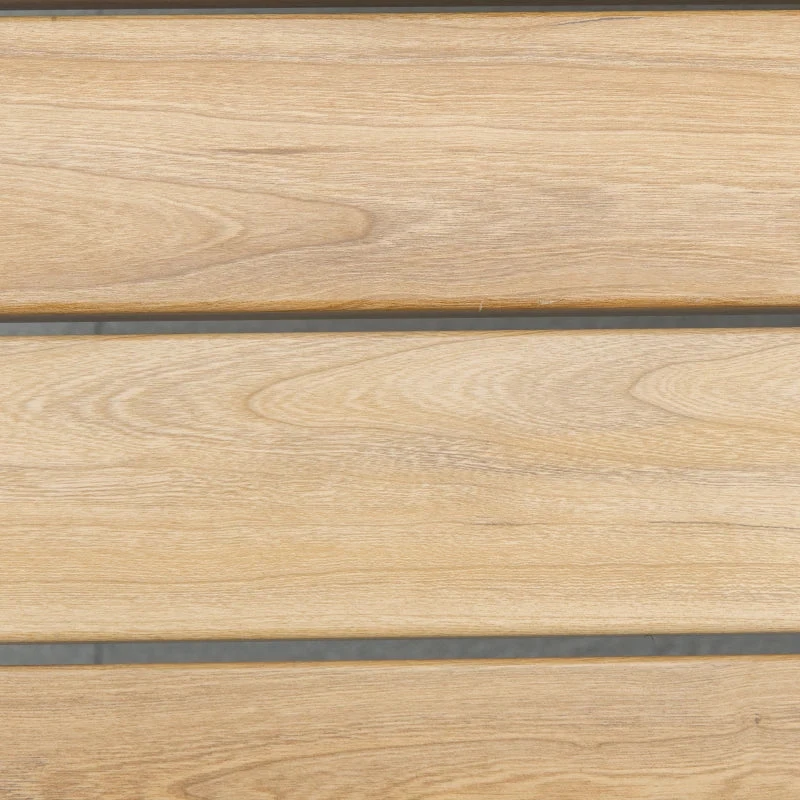 - Wood-effect slats on the table and armrests for a natural look