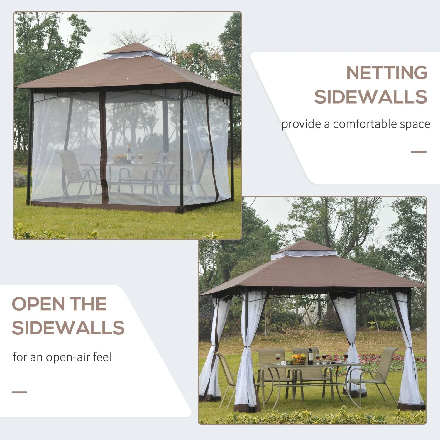 A great garden, patio, or home accent, this Outsunny gazebo features a metal frame, UV-resistant top and side nettings. Its double roof offers air circulation and 8 drainage holes for rain. Equipped with bug-blocking sides, it’s an ideal, multifunctional addition for any outdoor décor.