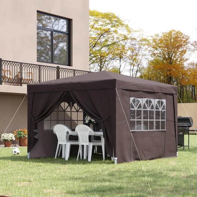 This 2.95 m x 2.95 m gazebo with sides is a great, no-fuss outdoor shelter. It is Ideal for family parties, weddings, picnics, sports events, outdoor vendors, craft fairs, job sites and camping trips. This pop up gazebo provides easy set-up and take down in less than one minute. It also comes with a portable carrying case. This garden shelter has a high-quality powder-coated steel frame which has high strength and is suited for winter, with PVC coated sidewalls for mild weather resistance.
