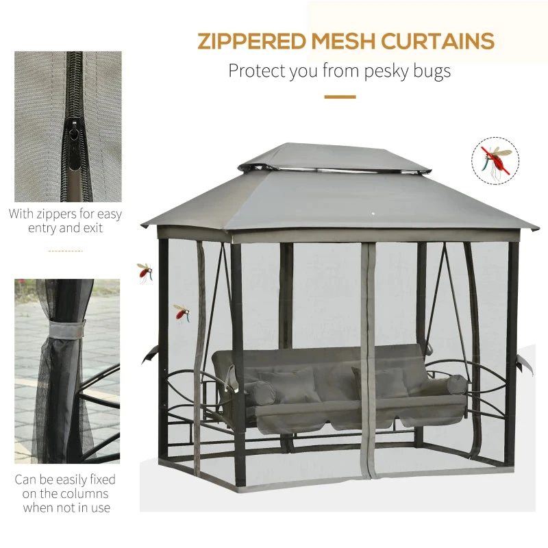 The 3 seaters multi-functional swinging garden chair can be converted to a single bed in seconds. With cushions, two soft pillows and two neck rolls, swing seat with canopy offers optimal comfort whether you are sitting or lounging. The removable zippered mesh curtains on all sides protect you against mosquitoes and allow for fluid air circulation. The gazebo swinging chair bench with a 300kg weight capacity allows you to relax on the comfortable swing chair hammock with your loved ones.
