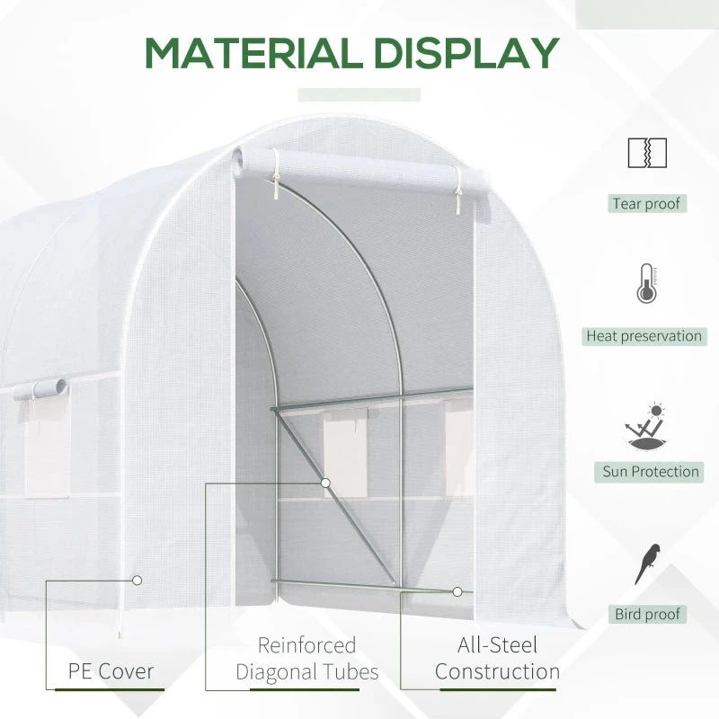 This Outsunny 2.5 x 2 x 2m polytunnel large is perfect for year-round gardening. Features a durable polyethylene covering with grid threading and a sturdy Galvanized Steel Tube frame. Our poly tunnels with door is great for seeding, or just to protect your young plants from cold. Thisplastic greenhouse walk in design brings the protective surroundings that you need, without spending large amounts of money needed for a purpose built greenhouse.