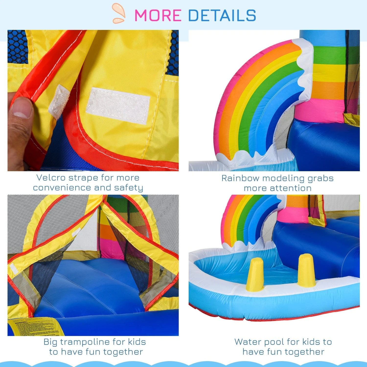 - DUO DESIGN: Trampoline with small pool attached on the front for double the amount of fun. Bright and colourful rainbow design, making it extra fun for kids to look at and play in.