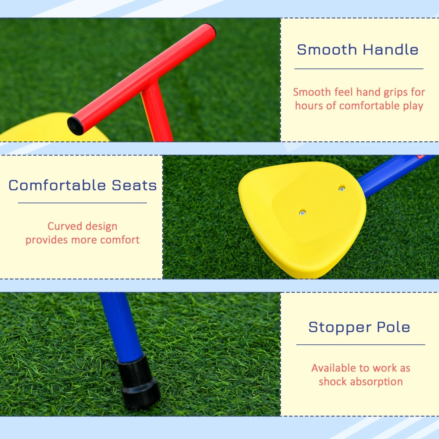 Our seesaw for kids from Outsunny is a great toy for children that combines the fun of a traditional seesaw with a 360-degree swivel. Constructed with a metal frame in powder coating, this teeter totter can thrive throughout years of play. Its sturdy metal frame, easy-to-grip handle, and comfortable seats make the seesaw a backyard favorite for any fun-loving kid ages 3-8. It is safely equipped with a stopper pole under each seat to absorb shock to the seats as they touch the ground, ensuring a smooth and soft landing. A great toy to provide hours of fun while burning off energy and helping them to work on balance and motor development!