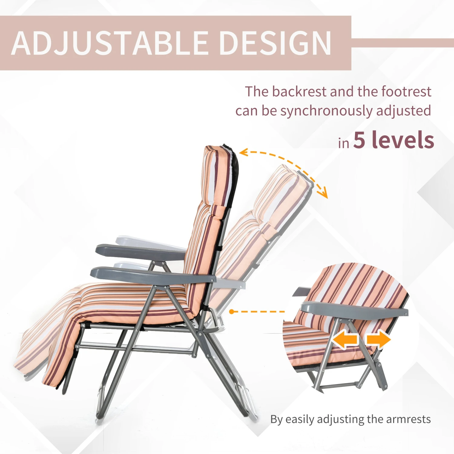 Features: – Foldable padded garden lounger with 5 position reclining adjustment. – Thick padded cushion for ultimate comfort while in use. – Grey powder coated tubular steel frame in superior strength. – Cushion with easy to care polyester cover for durable use. – Lightweight and foldable design allow easy storage and transport. – Ideal for camping, patio, garden or any other outdoor space use. – Assembly required. Specification: – Colour: Orange and White. – Material: Steel, Polyester, Cotton. – Overall Dimension: 60W x 75D x 65-102H cm. – Folded Dimension: 92L x 61.2W x 12H cm. – Weight Capacity (each): 120kg. – Armrest from Floor: 63cm. Item Label: 84B-571V70RD. SET OF 2 PADDED SUN LOUNGER: Folding garden recliner chair feature a reclining relaxer garden chair with padding cushion for extra comfortable ADJUSTABLE: Lockable powder coated steel frame in 5 position adjustment, lock in any position from sitting up to laying down EFFORLESS: Lightweight and foldable for easy storage and transport, ideal for camping or patio use, or just as a reflexology chair DURABLE: Comes with weather resistant polyester seat cover and high quality backrest spring for long time reliable use Overall Dimension: 60W x 75D x 65-102H cm, Weight Capacity (each): 120kg