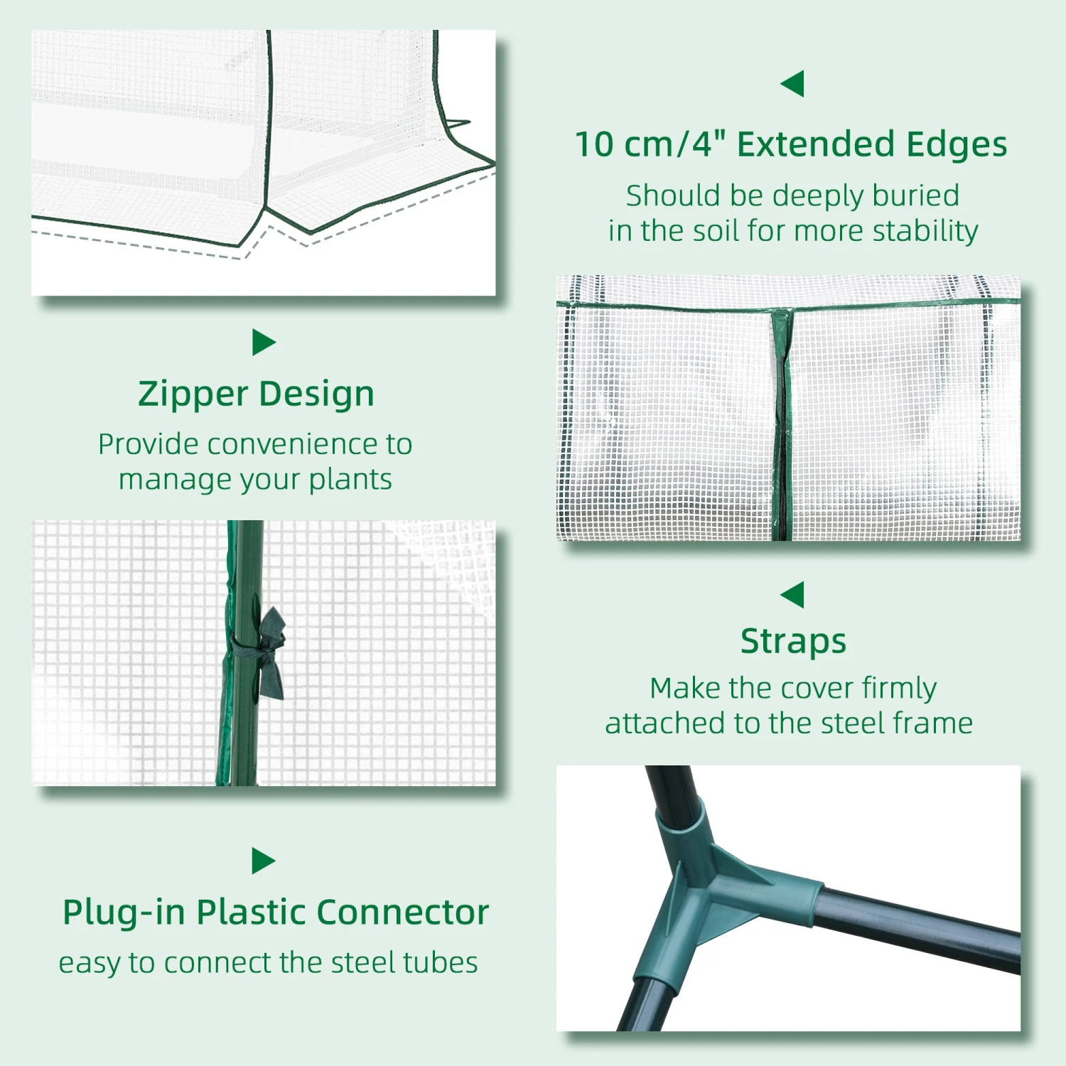 - Extended edges should be deeply buried in the soil to tighten the cover for more stability