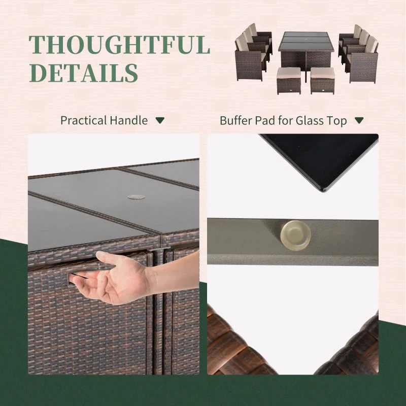 The Outsunny 11 pieces garden dining furniture set creates an inviting setting, ideal for patio, porch, poolside, and garden. The rattan cube dining sets is designed from a beautiful wicker material on a reinforced aluminum frame. The wicker and tempered glass table of the rattan garden dining set looks very fashionable and creates a modern style for your outdoor living area. The rattan cube dining set is suitable for any occasion, family dinners, parties, and more.