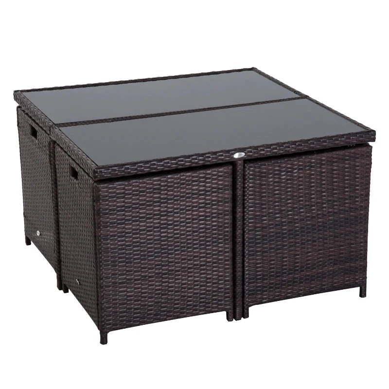 - 9 pieces rattan dining set includes 1 table, 4 chairs and 4 footrests