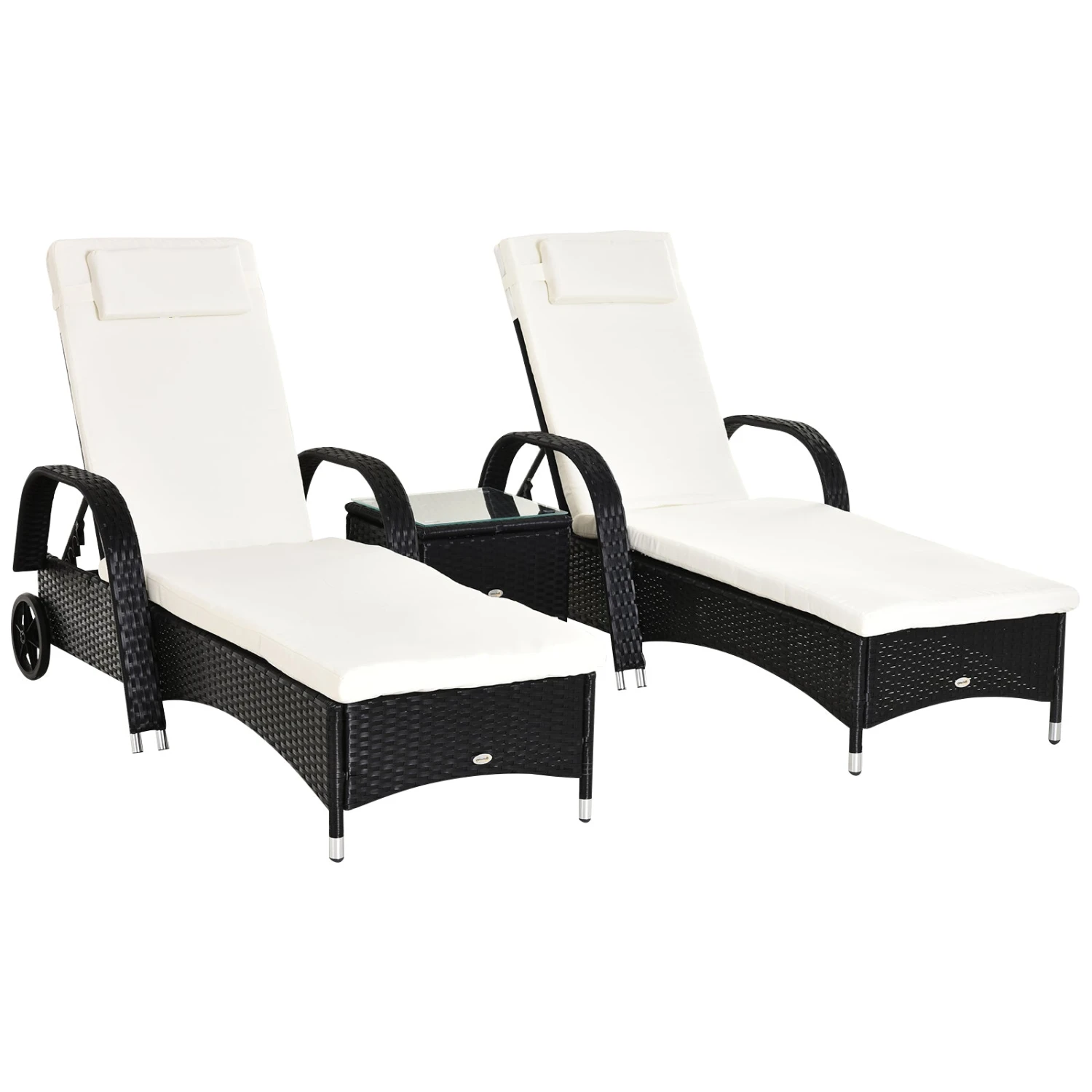 The rattan patio chaise lounge set from Outsunny comes complete with 2 loungers, 1 side table and cushions. The seat has 5 adjustable positions to give maximum relaxation and comfort. The side table also has a glass top to keep your drinks at easy reach, and the set can be used indoors and outdoors.