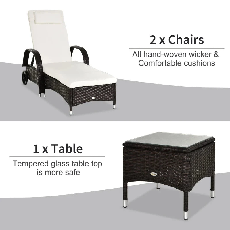 The rattan patio chaise lounge set from Outsunny comes complete with 2 loungers, 1 side table and cushions. The seat has 5 adjustable positions to give maximum relaxation and comfort. The side table also has a glass top to keep your drinks at easy reach, and the set can be used indoors and outdoors.