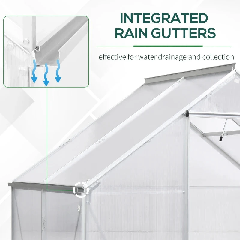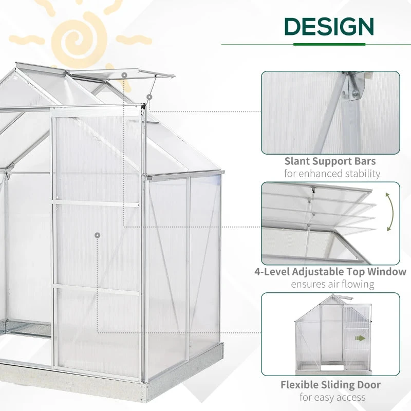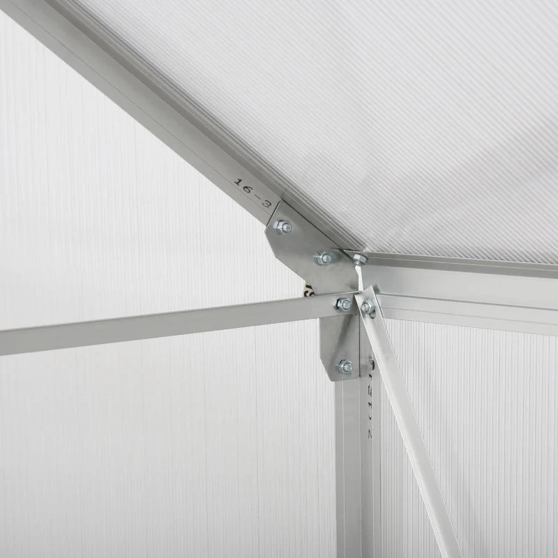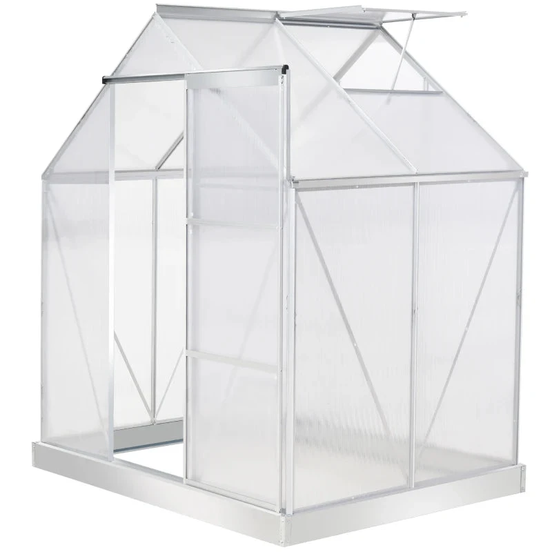 Let your plants grow heartily with this outdoor greenhouse from Outsunny. Inner area provides plenty of growing room, with an aluminium frame keeping the structure upright and in place, surrounded with durable polycarbonate panels, which protects from rain and harsh sunlight. A sliding front door provides easy access, with a small window for ventilation inside when needed. Galvanised steel base for extra strength.