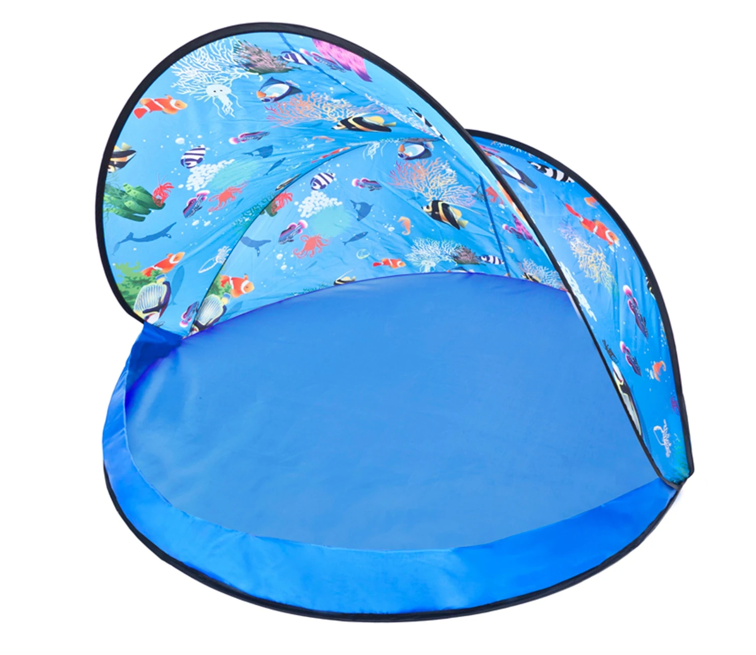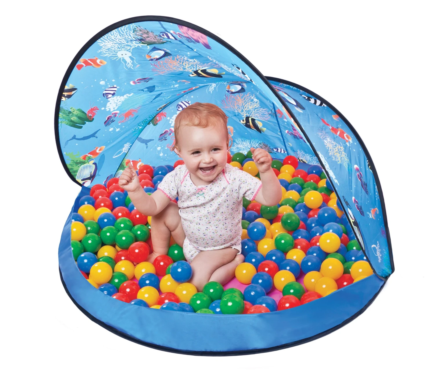 This colourful, easy to clean, 120 cm diameter, blue half tent has a UV protection of 30+ and is perfect for the beach on holiday or your garden, or even a picnic in the park to help protect your child from the harsh summer sun and can also be used as a sun shelter for when your child is in a sand pit or a paddling pool, that can fit into the shelter. It comes with 50 multicoloured balls. The tent folds and it comes with a bag for easy storage. Suits ages 10 months +. Dimensions 120 x 120 x 80 cm.