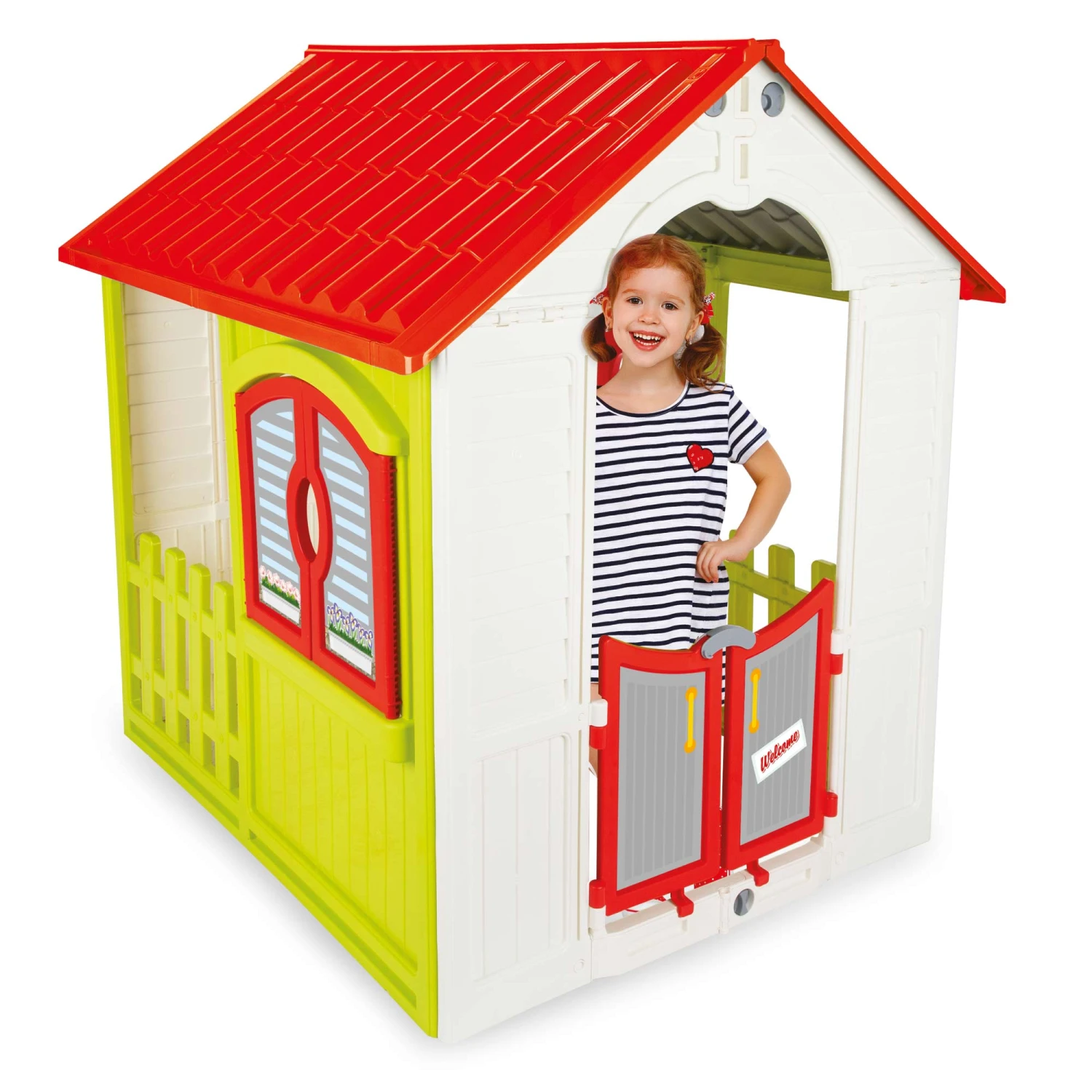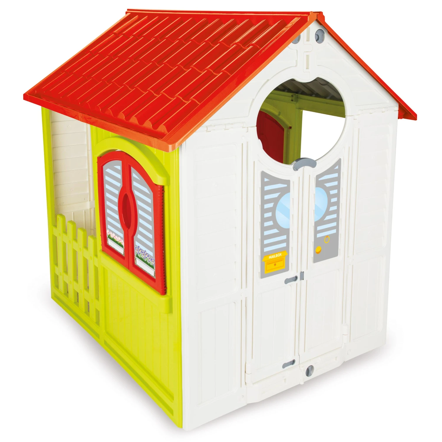 This large easily assembled folding playhouse folds flat by a simple folding mechanism, the two roof sections unclip from one-another and separate and fold back against the sides of the house and the front and rear concertina in. It has a large entrance with two half doors, the sides have opening windows and gated openings with non-removable fence and the rear has a further entrance with two large doors. It also has a realistically styled roof with tile effects and is suitable for outdoor and indoor use. Suits ages 3 years +. Dimensions: 92 x 110 x 109 cm.